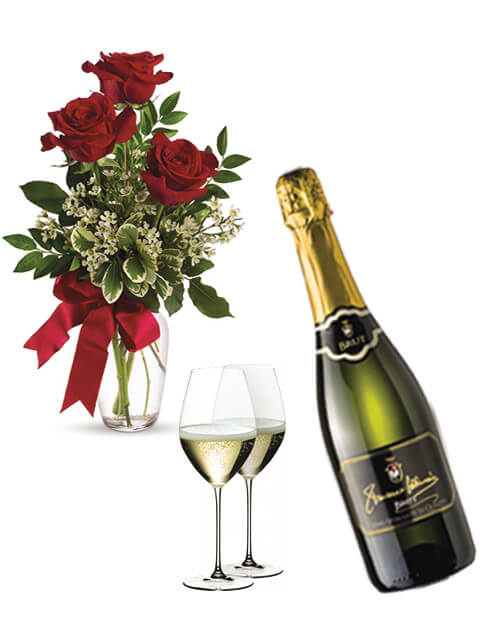 Tre rose rosse e champagne: un’idea regalo di livello, per trasmettere sentimenti puri. Il vaso delle rose non è incluso.